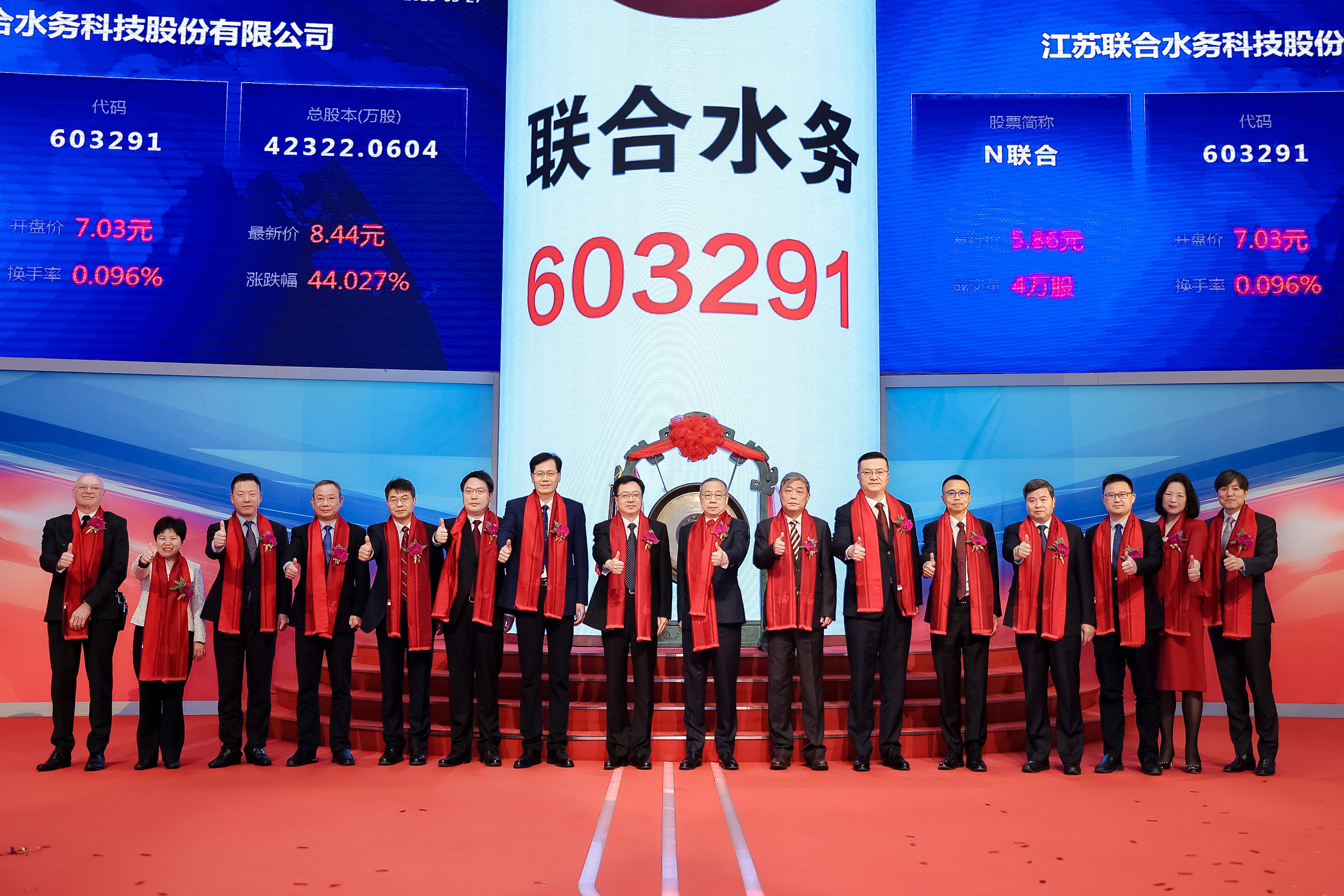 3月27日上午,江蘇聯合水務科技股份有限公司(股票代碼:603291.SH)首次公開發行股票上市儀式在上海證券交易所隆重舉行。宿遷市委書記陳忠偉,上海交通大學黨委常委、副校長張安勝,上海證券報社黨委書記、董事長葉國標,聯合水務董事長、總裁俞偉景等領導共同為聯合水務股票交易鳴鑼開市。來自政府、股東、聯合水務、中介機構和媒體等百余名嘉賓參加了上市敲鑼儀式,共同見證了聯合水務掛牌上市的歷史性時刻。